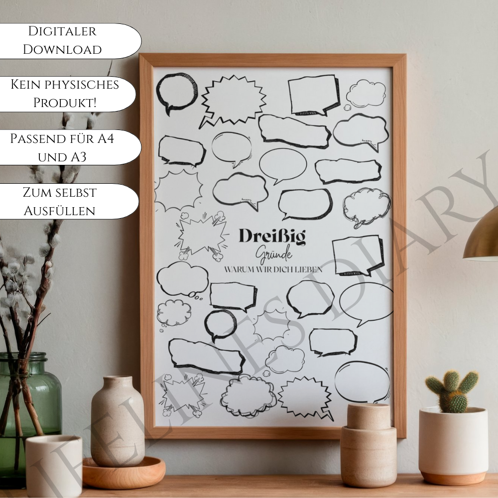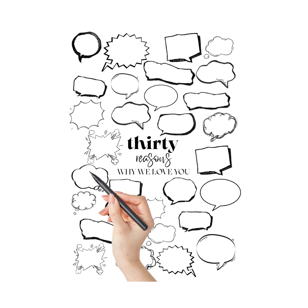 Die Vorlage eignet sich perfekt als Geschenk zum 30. Geburtstag – oder als besondere Aktion auf der Geburtstagsfeier. Lege sie aus, damit sich Freunde und Familie wie in einem Gästebuch eintragen können. So entsteht ein einzigartiges Erinnerungsstück, das auch Jahre später noch berührt.