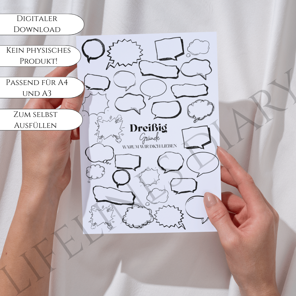 30 Gründe, warum wir dich lieben – Geburtstagsvorlage zum Ausfüllen – Bundle DE & EN