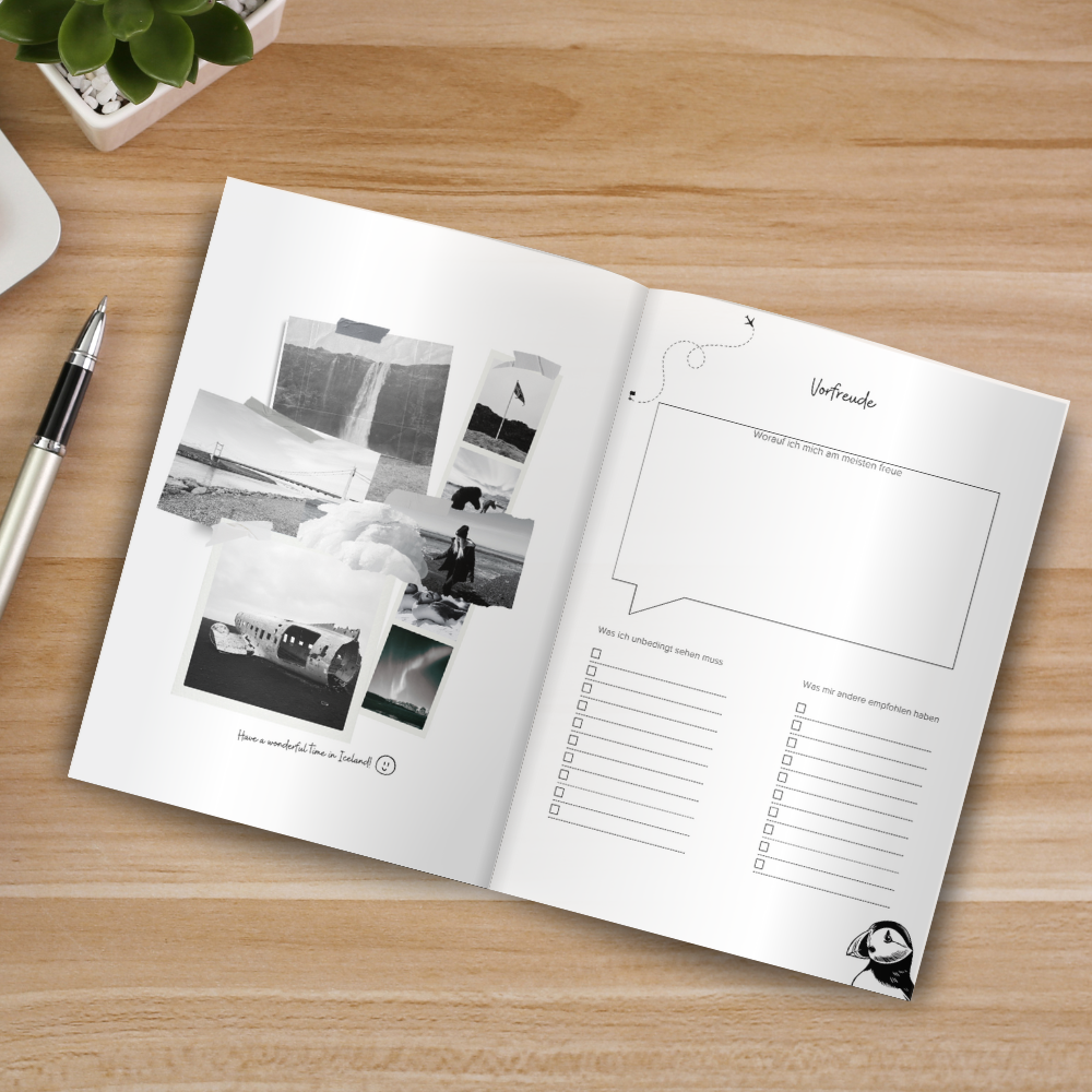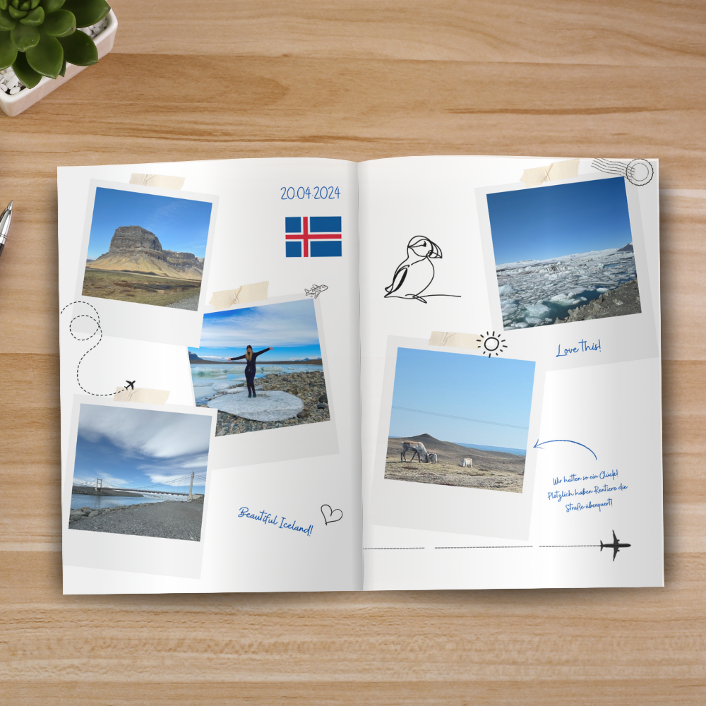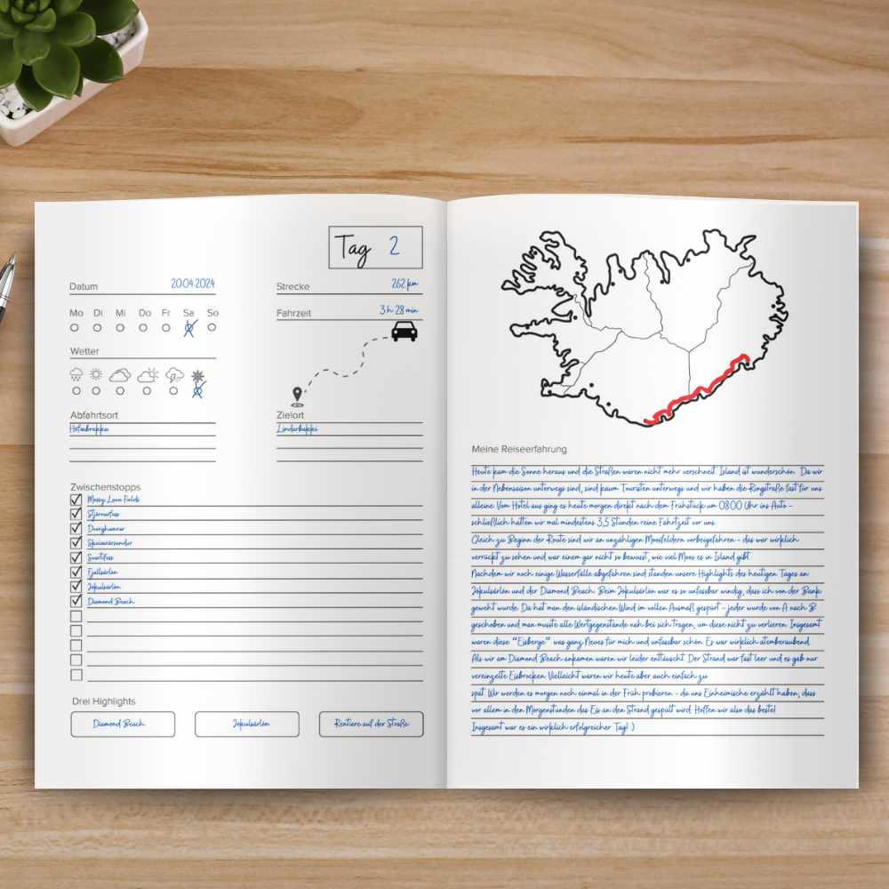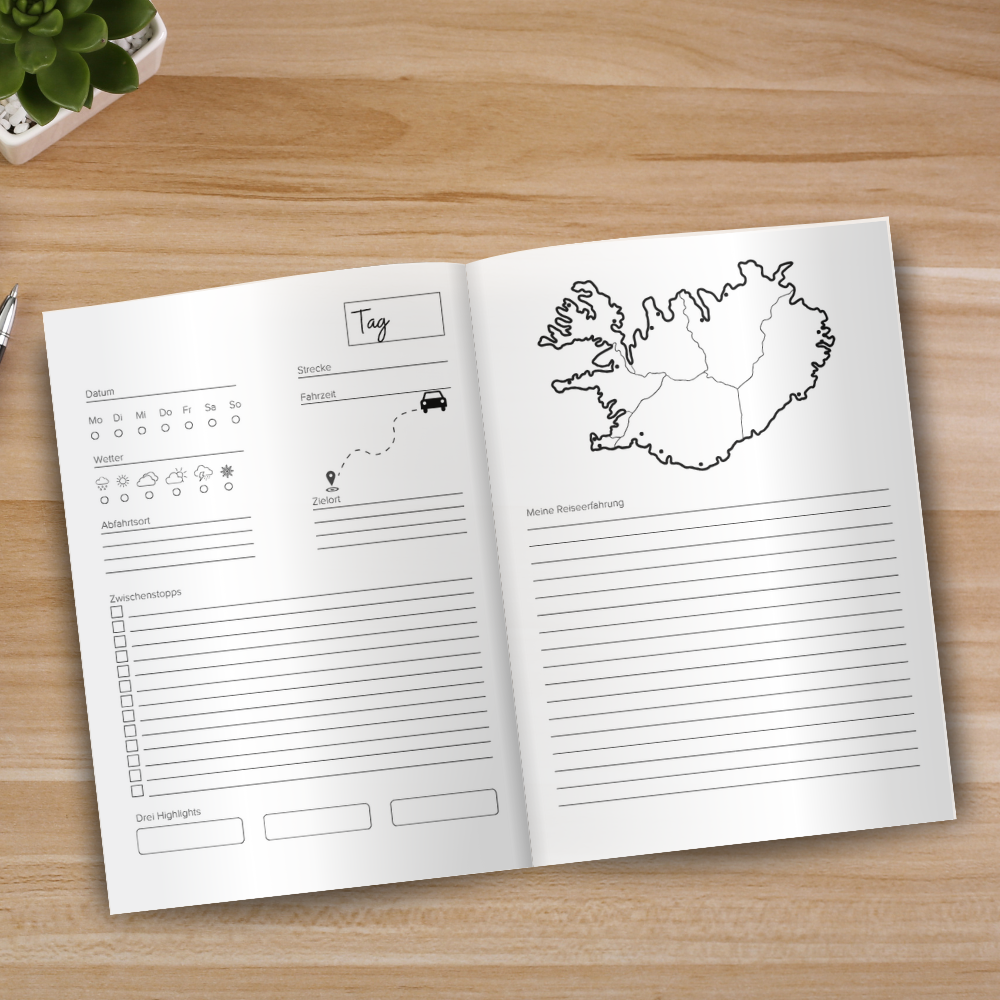 Island Reisetagebuch – Dein persönlicher Begleiter für unvergessliche Abenteuer! Planst du eine Reise nach Island? Dann ist dieses Reisetagebuch genau das Richtige für dich! Es hilft dir nicht nur dabei, deine Erlebnisse festzuhalten, sondern bietet auch wertvolle Unterstützung bei der Planung. Inklusive vorgeplanter 8-Tage-Route auf Google Maps! Du findest eine hinterlegte Beispielroute für 8 Tage, mit einer detaillierten Tagesplanung und Vorschlägen für Sehenswürdigkeiten, die du entlang deiner Reise entdecken kannst. Google My Maps mit markierten Highlights! Zusätzlich gibt es eine Google My Maps Karte, auf der die wichtigsten Sehenswürdigkeiten in Island bereits markiert sind – so hast du die perfekte Orientierung für deinen Roadtrip. Viel Platz für deine Reiseerlebnisse!