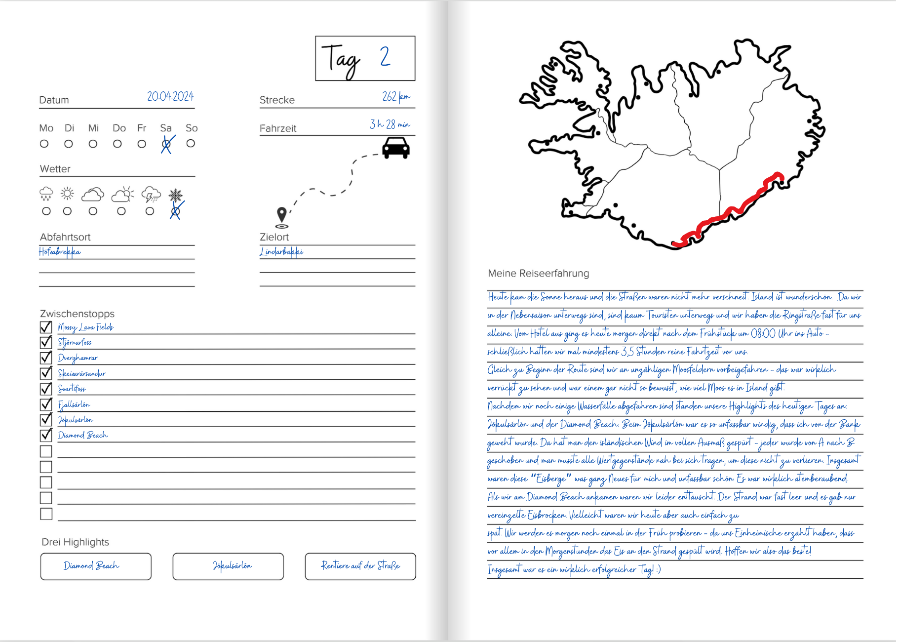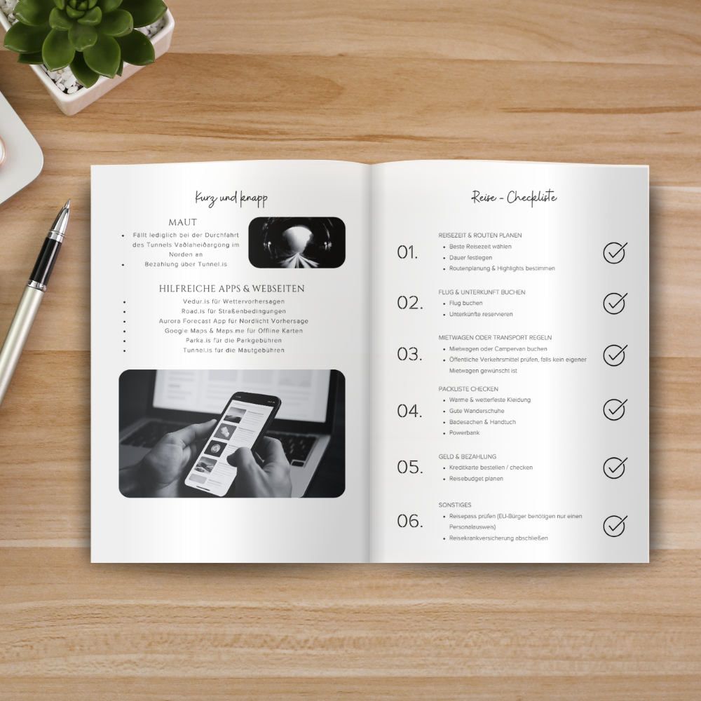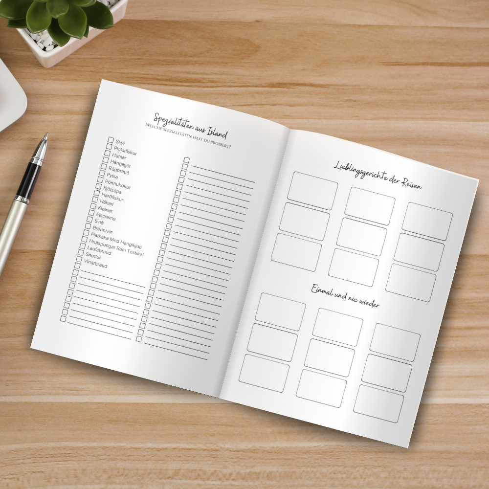 Island Reisetagebuch – Dein persönlicher Begleiter für unvergessliche Abenteuer! Planst du eine Reise nach Island? Dann ist dieses Reisetagebuch genau das Richtige für dich! Es hilft dir nicht nur dabei, deine Erlebnisse festzuhalten, sondern bietet auch wertvolle Unterstützung bei der Planung. Inklusive vorgeplanter 8-Tage-Route auf Google Maps! Du findest eine hinterlegte Beispielroute für 8 Tage, mit einer detaillierten Tagesplanung und Vorschlägen für Sehenswürdigkeiten, die du entlang deiner Reise entdecken kannst. Google My Maps mit markierten Highlights! Zusätzlich gibt es eine Google My Maps Karte, auf der die wichtigsten Sehenswürdigkeiten in Island bereits markiert sind – so hast du die perfekte Orientierung für deinen Roadtrip. Viel Platz für deine Reiseerlebnisse!