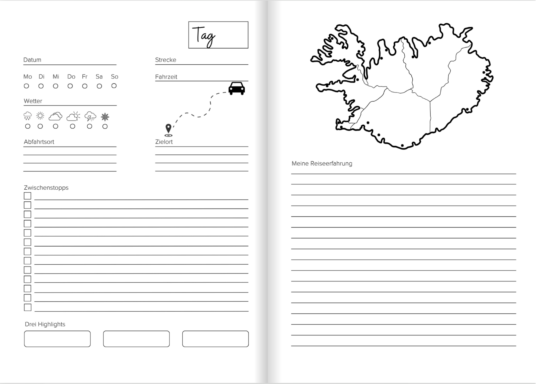 - 21 Tage Reisetagebuch mit vier Seiten pro Tag