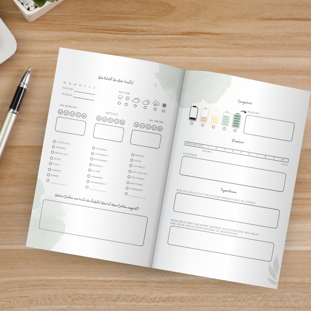 Dieses Tagebuch bietet dir die Möglichkeit, täglich deine Emotionen und die Umstände, die sie beeinflussen, festzuhalten. Es hilft dir dabei, Muster und Auslöser deiner Stimmungen zu erkennen, und unterstützt dich bei der Entwicklung von Strategien, um dein emotionales Gleichgewicht zu verbessern.